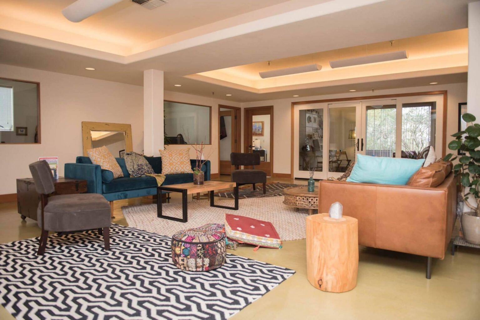 Our meeting space is a carefully curated circle of unique chairs, couches with funky cushions, and rugs of different patterns that somehow create a cohesive whole.
