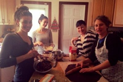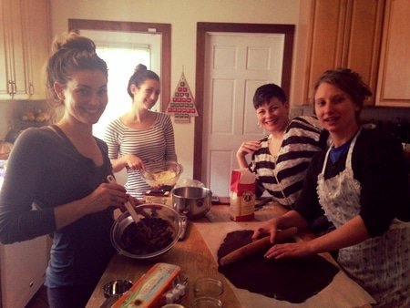 If you thought we stopped at gingerbread, think again. Here, Rachel (left) mixes up her famous brown butter chocolate chip cookies and Hope (middle left) whips up some snickerdoodles. Natalie (middle right) provided moral support through serenades and jokes.