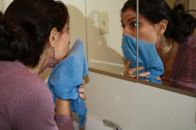 When the mask is dry, it's time to rinse it off! I like to use an old towel again here to make sure I get all the mask off.